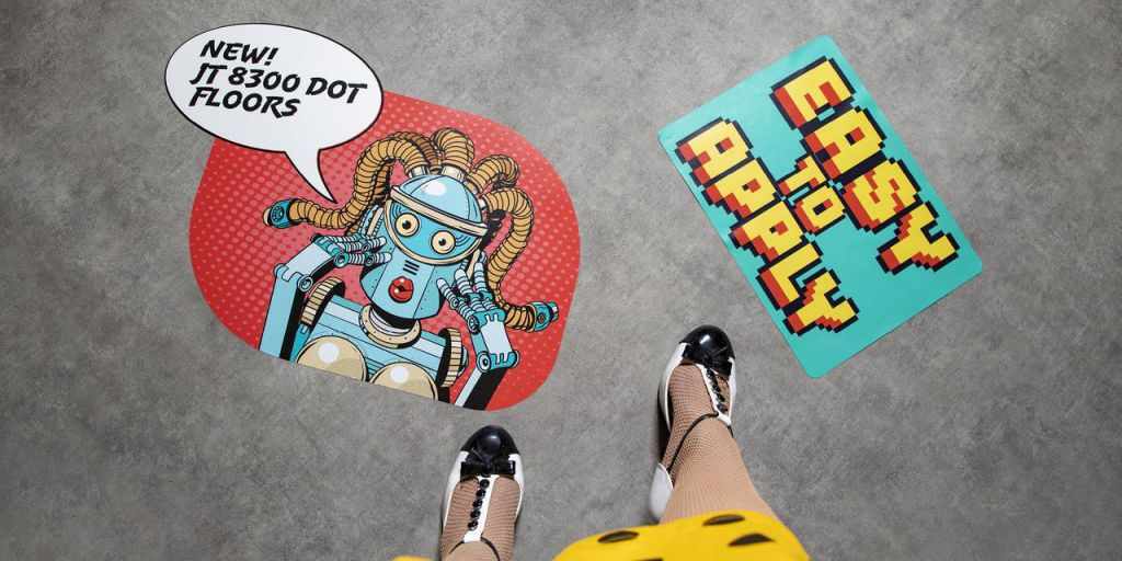 Mactac JT 8300WM-RT Dot Floors ist eine weiße, matte PVC-Digitaldruckfolie für kurzfristige Werbebotschaften auf Fußböden.