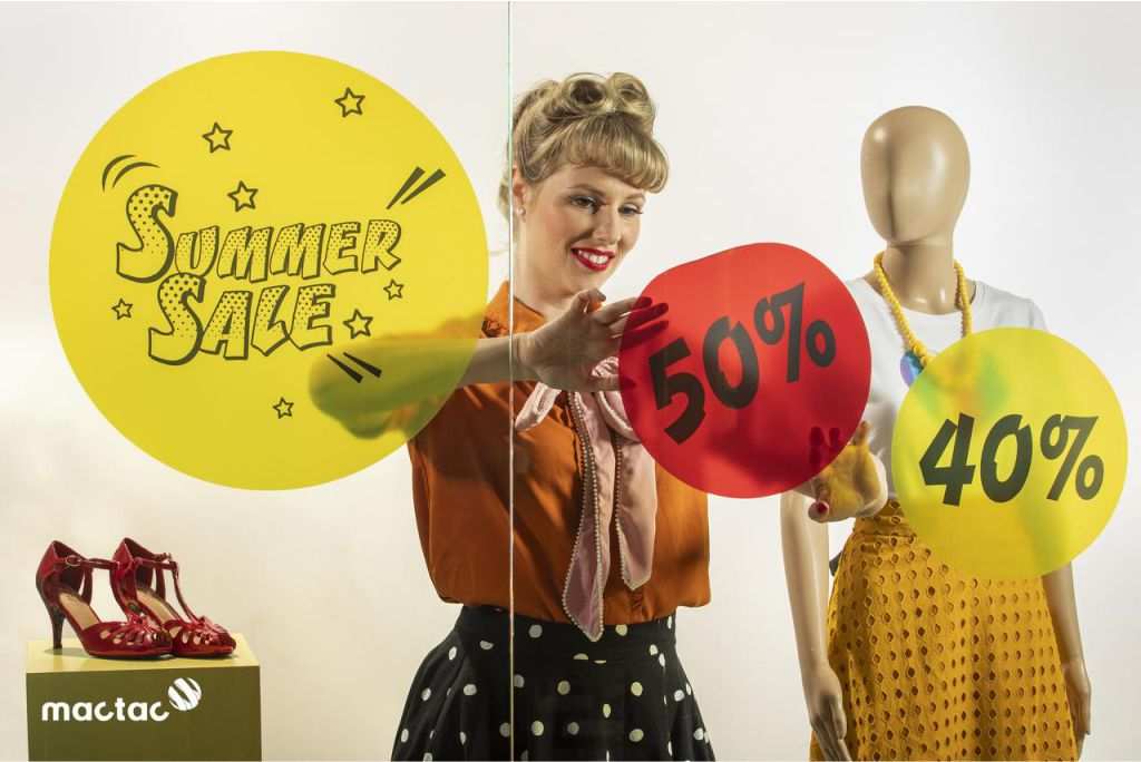Mactac JT 8300CG-RT Dot ist eine transparente, glänzende PVC-Digitaldruckfolie für kurzfristige Werbebotschaften, wie z.B. Rabattaktionen in Schaufenstern von geschäftlichen Ausstellungs- und Verkaufsräumen.
