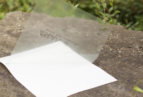 • Dank der Transluzenz der Sandstrahlfolie und der Transparenz des Polyesterliners ist eine genaue Positionierung der Folie möglich
