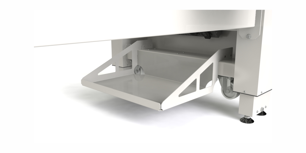 Der darunter integrierte Kompressor ist auf diesem Regal montiert und bewegt sich mit dem Arbeitstisch mit, was für