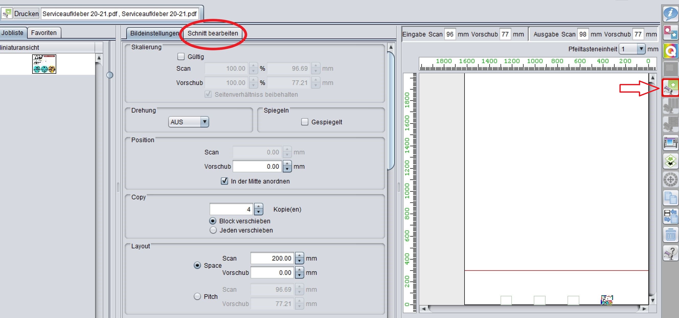 1. TestCut durchführen und Andruck/ Schnittiefe justieren