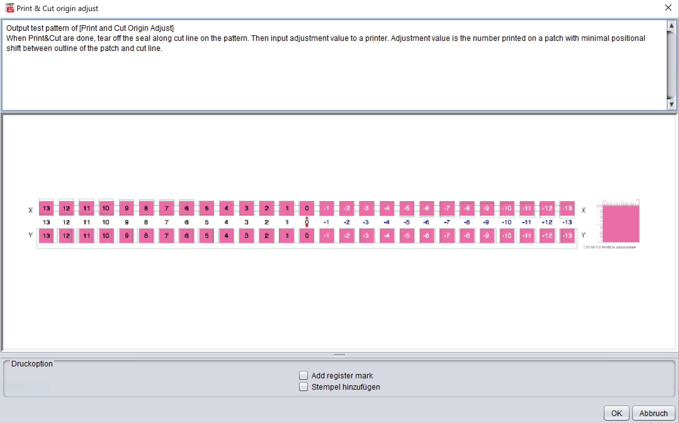1. Soll mit oder ohne Passermarken justiert werden? (Haken bei “Add register mark”)