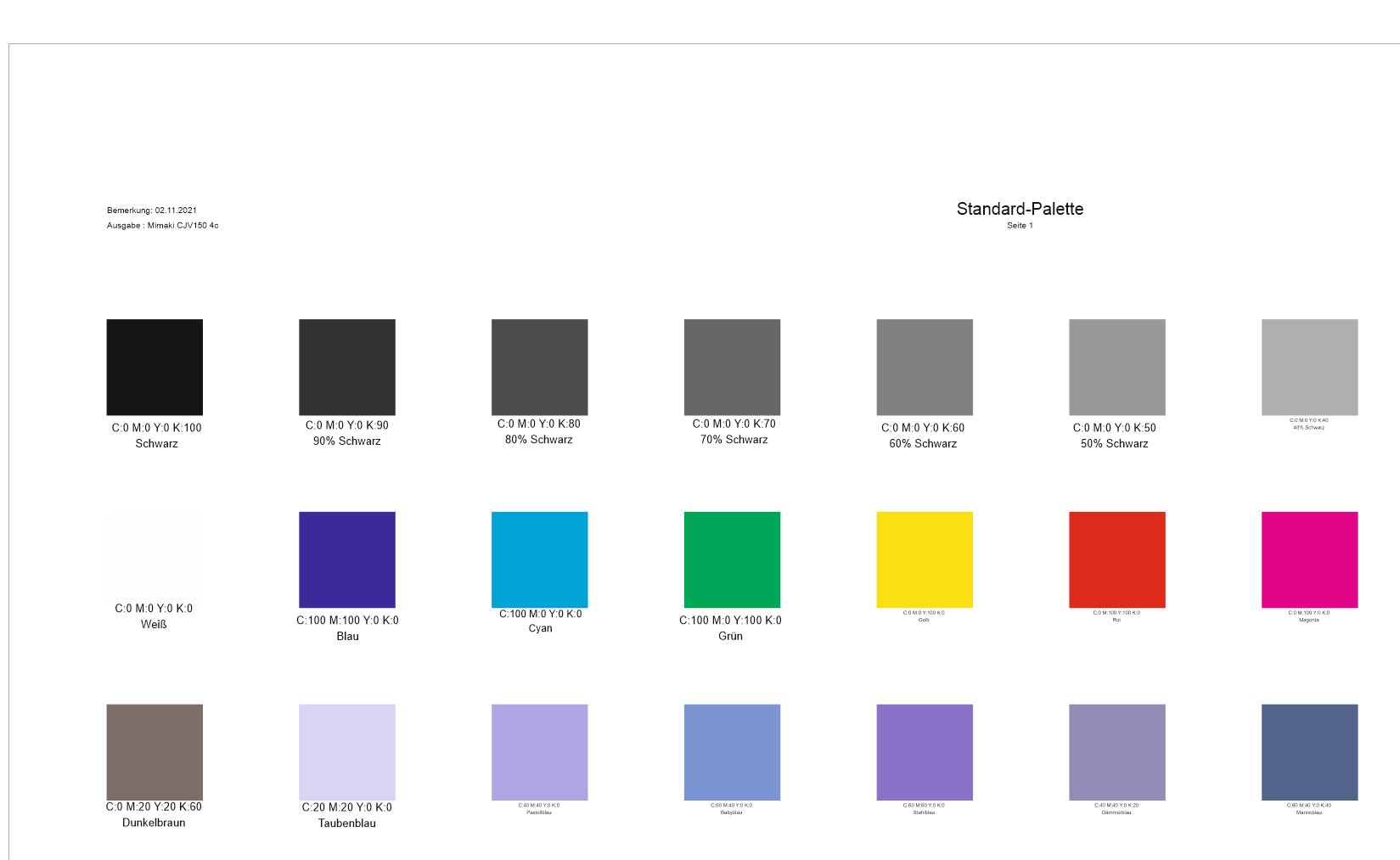Bei Farbpaletten, die mehr Farben haben als auf eine Seite passen, wird automatisch eine neue Seite erstellt – beim Export beachten!