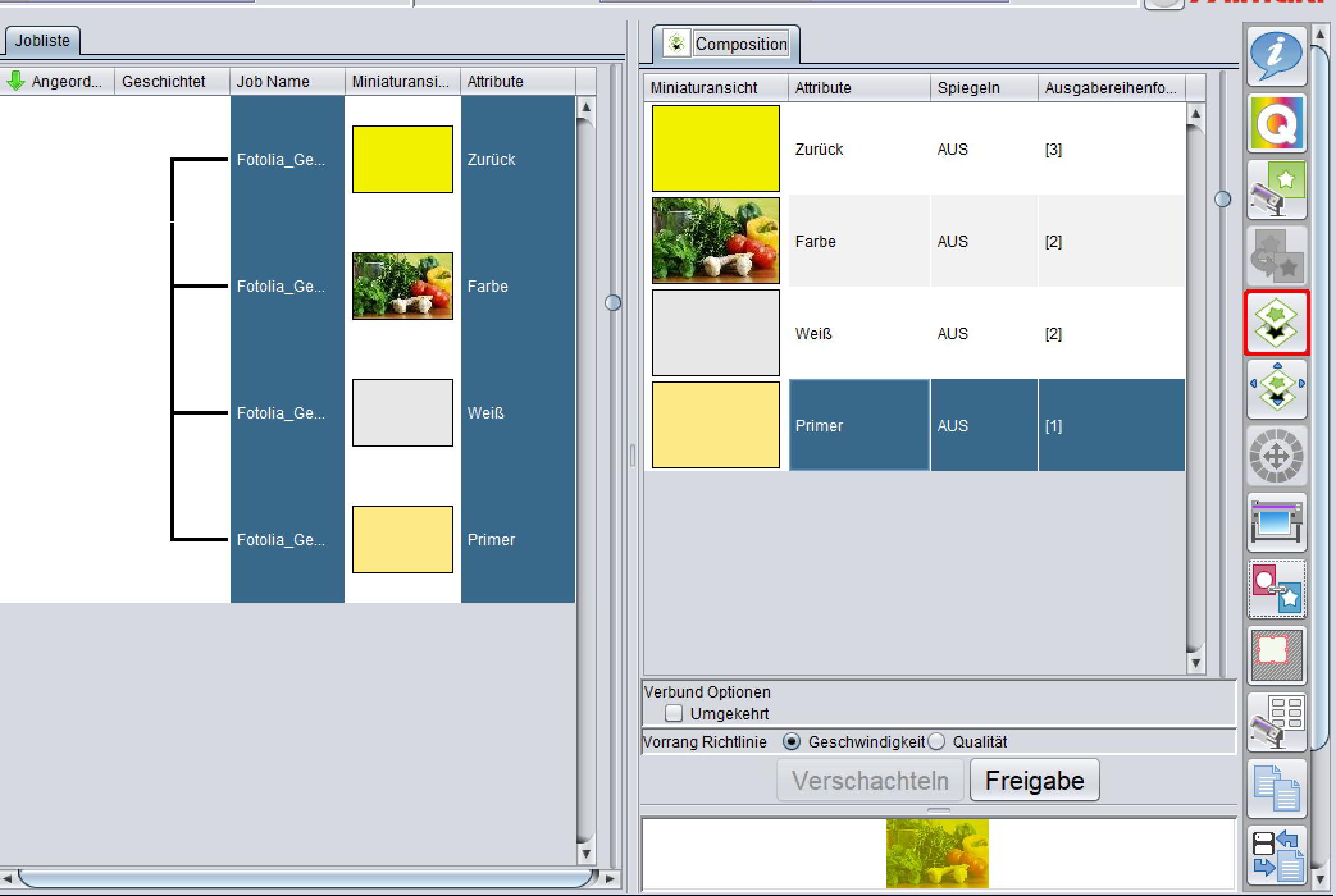 Die Reihenfolge kann mit Drag&Drop und mit dem Button Verschachteln geändert werden. Wenn der Job noch nicht wieder verschachtelt wurde, werden die Layer rot hinterlegt.