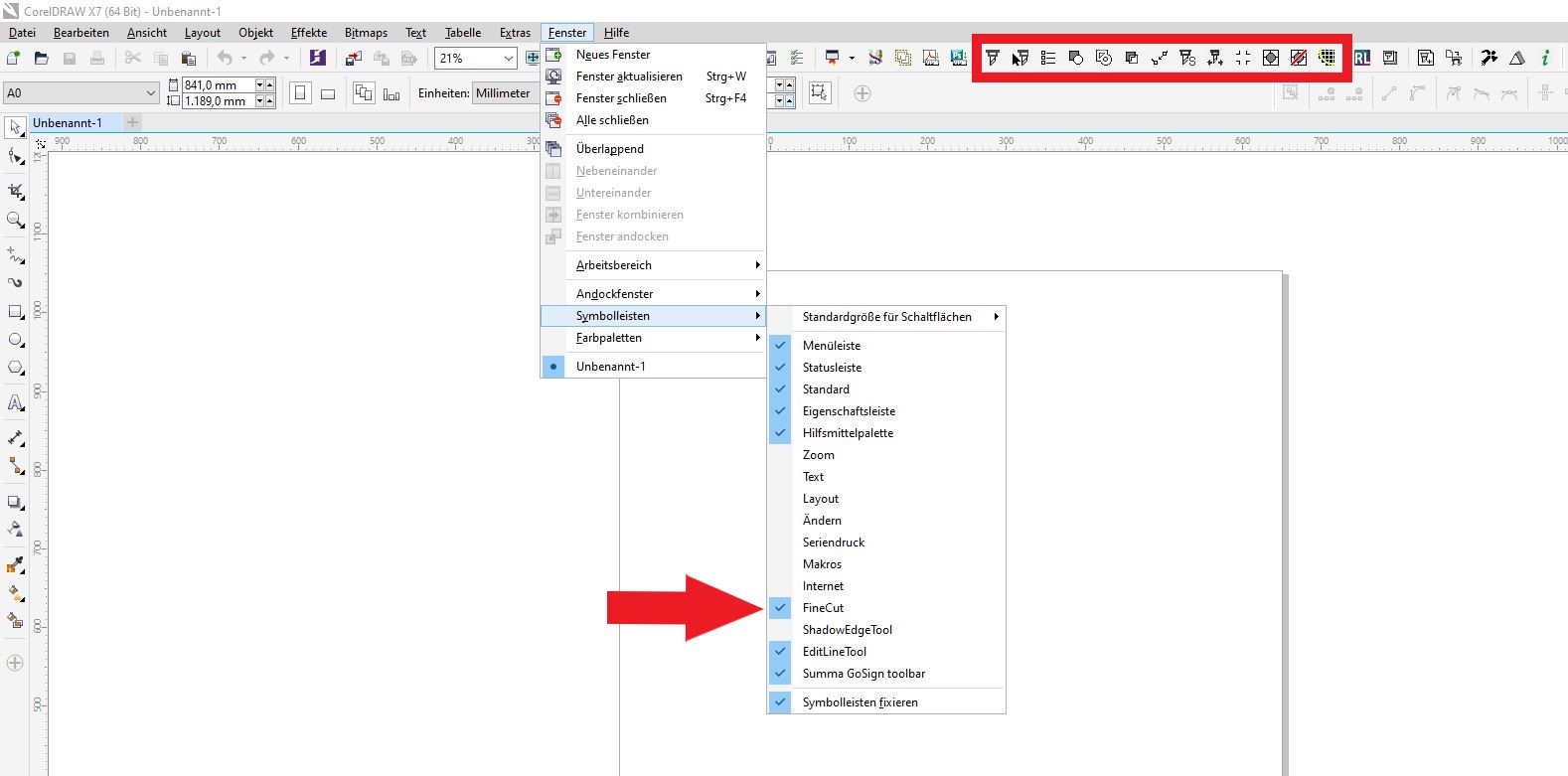 Wenn die FineCut Symbolleiste nicht mehr angezeigt wird oder nach der Installation nicht zu sehen ist, kann man über folgenden Punkt sich die Leiste wieder anzeigen lassen.