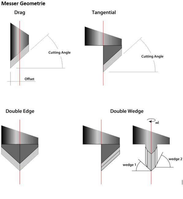 Es gibt zwei Arten von Klingen; Die erste sind Schleppmesser-Klingen, die um die Ecken gezogen werden und dabei in Kontakt mit dem Material bleiben. Die zweite sind tangentiale Messerklingen, bei denen die Drehung des Messers mittels Motor erfolgt.